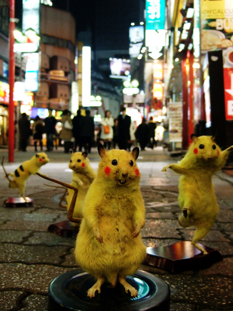 Stuffed rat captured in Shinjuku, Diorama of Shinjuku and more.